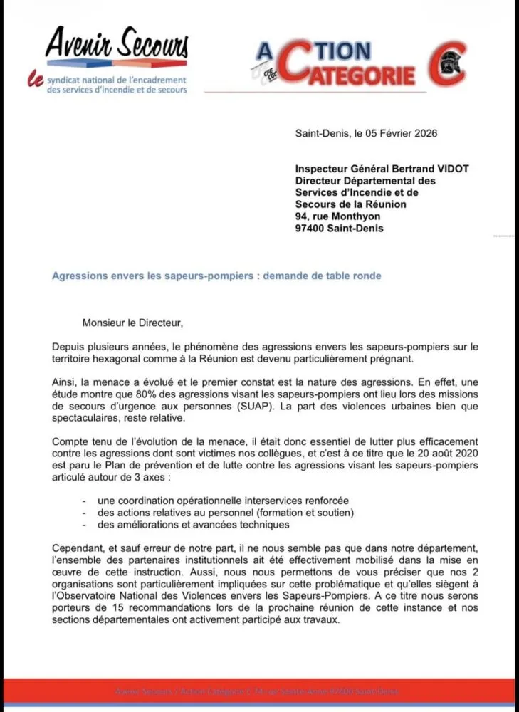 Face à la recrudescence des agressions dont sont victimes les sapeurs-pompiers, deux organisations syndicales représentatives des services d’incendie et de secours à La Réunion ont officiellement saisi les autorités de l’État. Dans un courrier daté du 5 février 2026, adressé au directeur départemental du SDIS de La Réunion, elles sollicitent l’organisation d’une table ronde réunissant l’ensemble des partenaires institutionnels et sociaux, sous l’autorité du préfet de La Réunion.