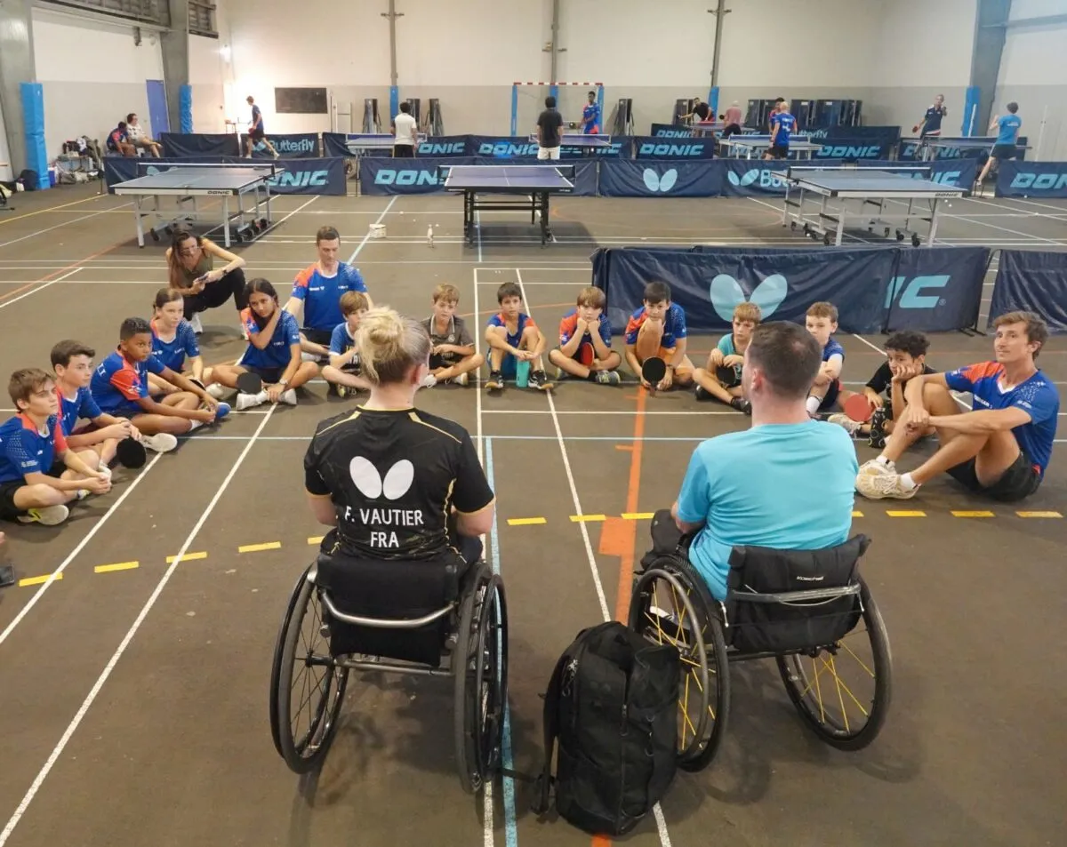L’opération a débuté par une session de questions-réponses très attendue. Les jeunes pongistes ont pu interroger Florian Merrien et Flora Vautier sur leur parcours, les différents handicaps en para tennis de table, ou encore la gestion du stress lors des Jeux paralympiques. Le médaillé de bronze a également pris le temps d’expliquer les règles spécifiques aux joueurs en fauteuil roulant, rendant la discipline plus concrète et accessible.