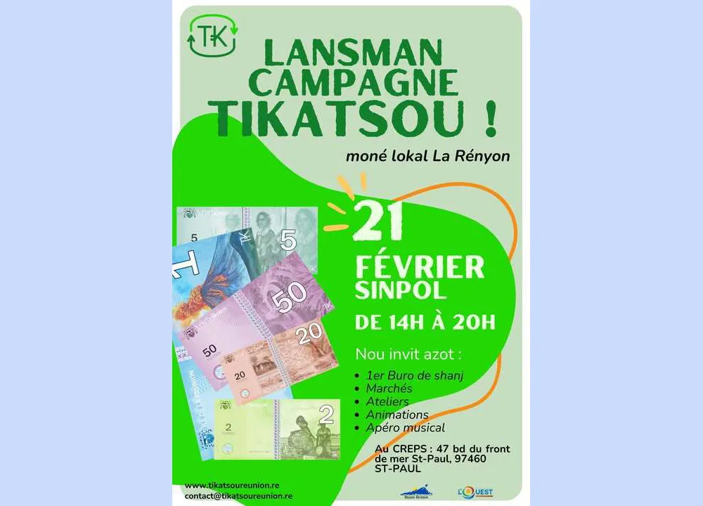 La campagne Tikatsou, dédiée à la promotion de la monnaie locale La Rényon, se tiendra le vendredi 21 février, de 14h à 20h, au CREPS de Saint-Paul, situé au 47 bd du front de mer.