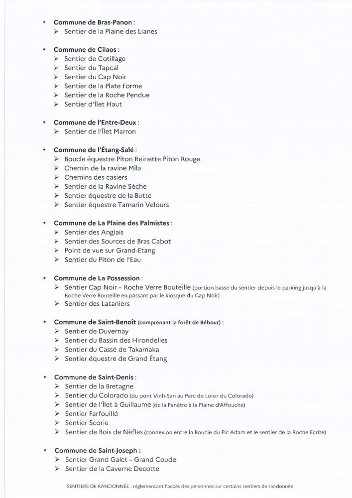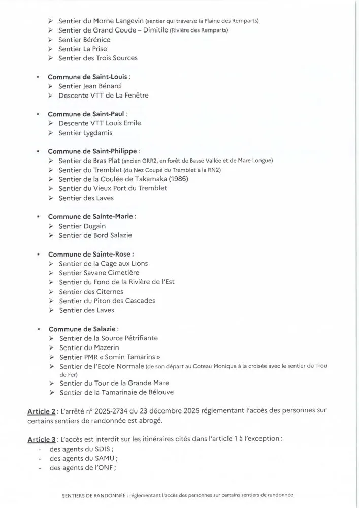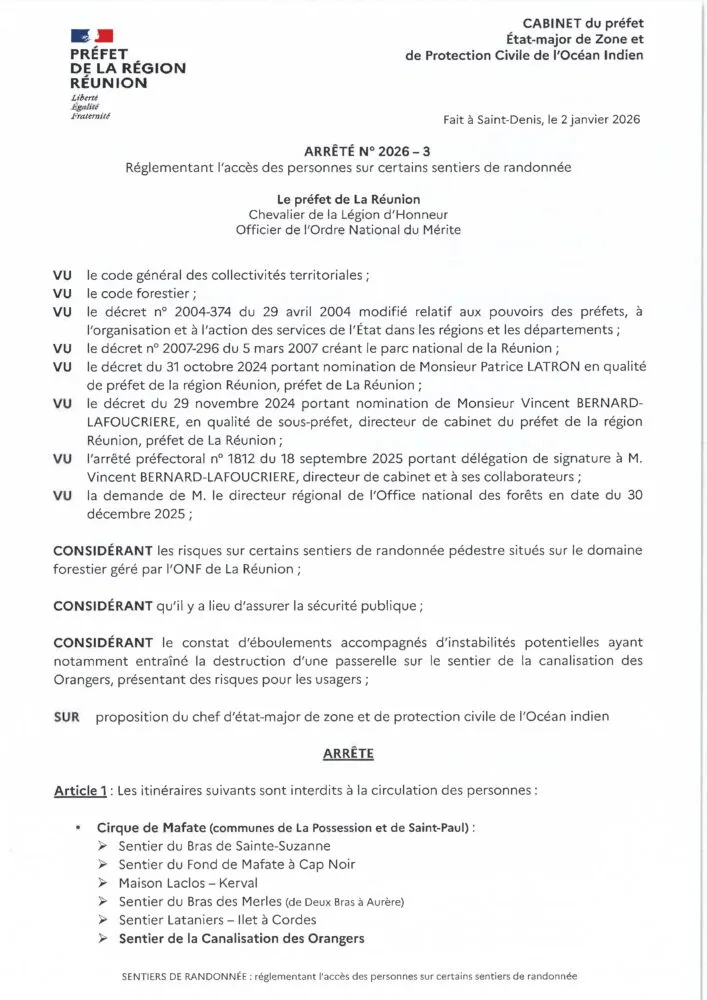 En raison de nouveaux éboulements, qui ont notamment entraîné la destruction d’une passerelle, le sentier de la Canalisation des Orangers ne pourra pas être rouvert le vendredi 2 janvier 2026 comme prévu initialement. Il restera fermé jusqu’à ce que le sentier soit sécurisé.
