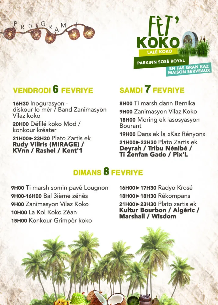 Le samedi 7 février, la Fet’ Koko bat pleinement son plein avec des animations et des concerts tout au long de la journée. Dans une ambiance conviviale et familiale, les visiteurs découvrent des démonstrations culturelles, des danses traditionnelles et des temps de partage autour du coco, tandis que la soirée est rythmée par une programmation musicale éclectique réunissant plusieurs artistes locaux.