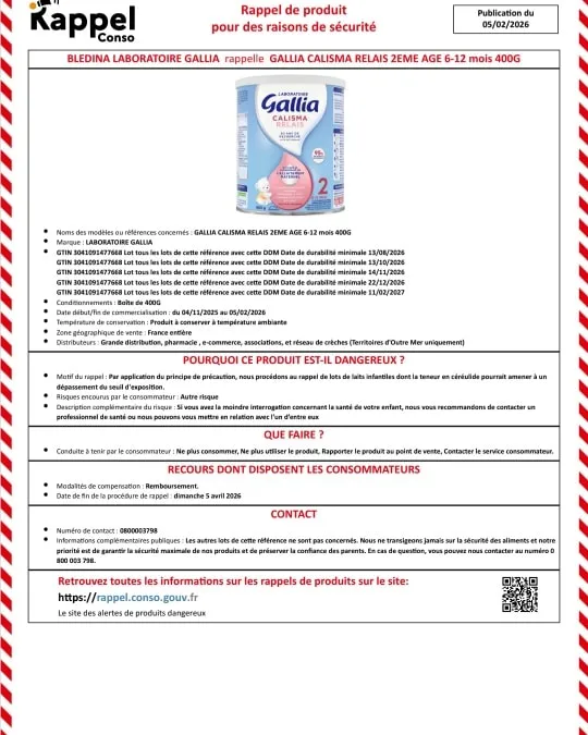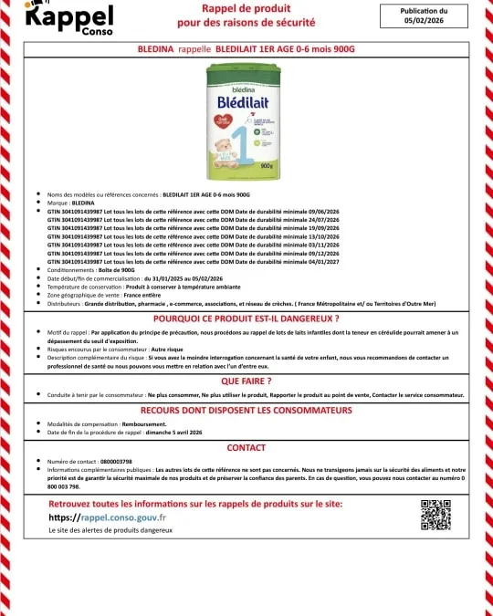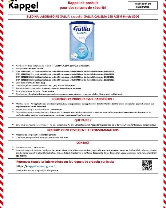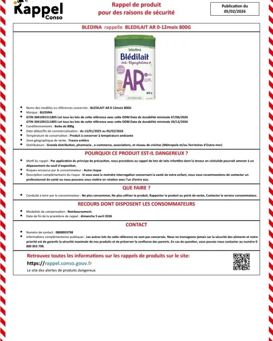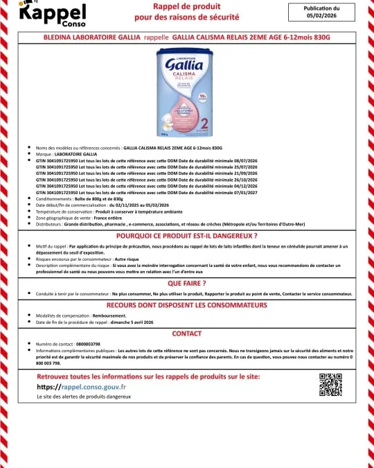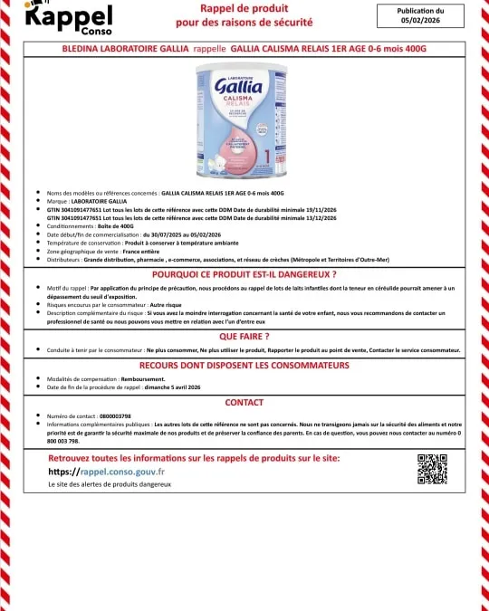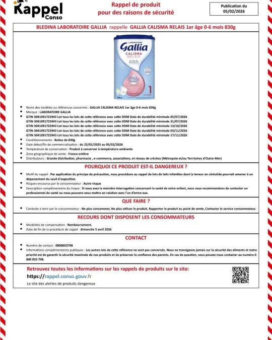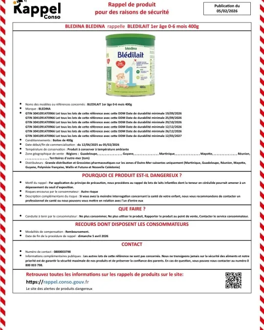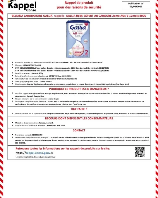 • Un rappel massif de laits infantiles a été annoncé le 5 février 2026