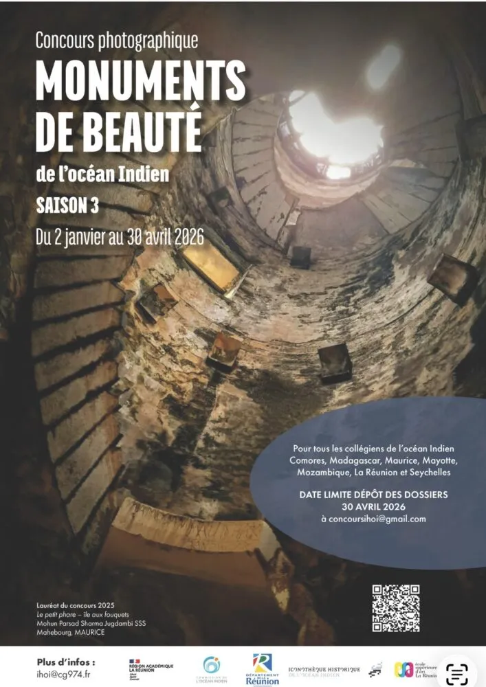 Regarder le monde, c’est toucher à sa diversité ». Cette invitation s’adresse une nouvelle fois aux collégiens de l’océan Indien à l’occasion de la troisième édition du concours photographique régional, « Monuments de beauté de l’océan Indien ». Se repérer dans l’espace, dans les pas de traqueurs de chefs-d’œuvre du patrimoine architectural et produire une photographie originale d’un monument emblématique, tel est le défi qui leur est lancé pour cette troisième édition !