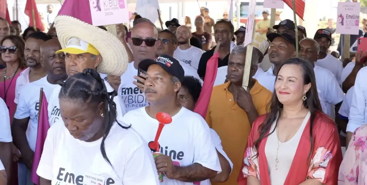 Le meeting organisé par Emeline K/Bidi se déroule actuellement à l’angle de la route de Ligne Paradis et du chemin Bordier, à Saint-Pierre, à proximité du commerce Fruits et Légumes Dinesh, et en présence de quelques centaines de personnes.