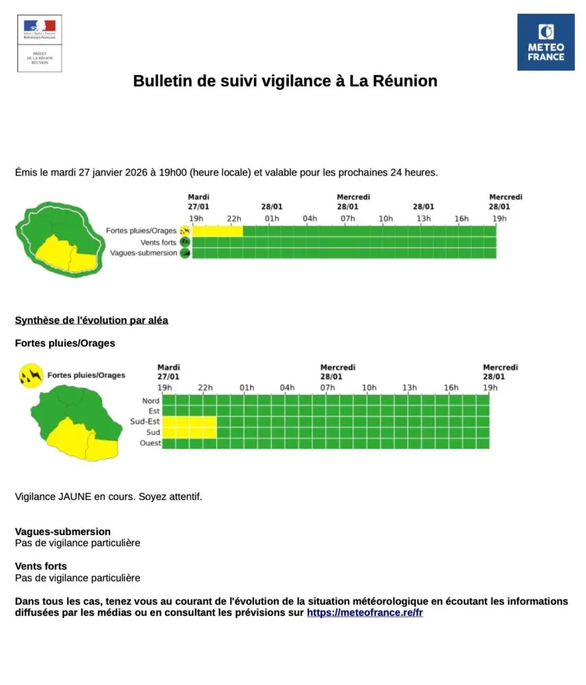 Météo-France a placé une partie de La Réunion en vigilance jaune pour fortes pluies et orages ce mardi 27 janvier 2026 à partir de 19 heures (heure locale).