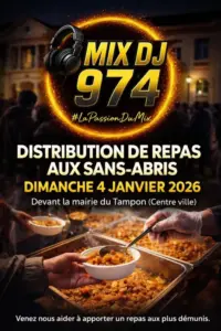 Le collectif Mix DJ 974, connu pour son engagement et sa passion pour la musique, organise une distribution de repas à destination des personnes sans-abri, devant la mairie du Tampon ce dimanche 04 janvier.