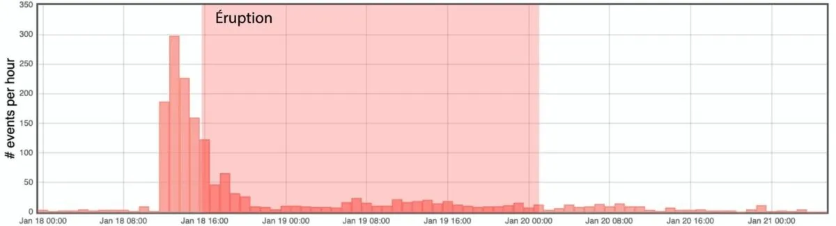 L’Observatoire Volcanologique du Piton de la Fournaise (OVPF-IPGP) a annoncé que suite à l’arrêt de l’éruption le 20/01/2026 aux alentours de 5h heure locale, une activité sismique est toujours enregistrée sous le sommet du volcan mais celle-ci est en diminution sur les 16 dernières heures, passant de 10 séismes volcano-tectoniques superficiels par heure à une moyenne de 3, soit un taux similaire à celui observé avant l’éruption.Ces séismes restent localisés aux alentours de 2 km de profondeur sous le sommet du volcan. Cette activité sismique indique que le système d’alimentation superficiel du volcan reste sous pression mais l’hypothèse d’une reprise activité imminente s’éloigne.À ce stade, le processus de pressurisation du réservoir superficiel peut se poursuivre pendant plusieurs jours à plusieurs semaines, voire plusieurs mois, avant qu’une nouvelle injection de magma ne se produise vers la surface ; il peut également s’interrompre sans conduire, à brève échéance, à une éruption.A noter qu’au cours de la nuit les rougeoiements des coulées de lave se sont estompés indiquant que la surface des coulées se refroidissaient. Néanmoins le cœur des coulées peut rester chaud pendant plusieurs mois et des fumerolles persistent. L’intensité des fumerolles peuvent s’intensifier après les épisodes de pluie.