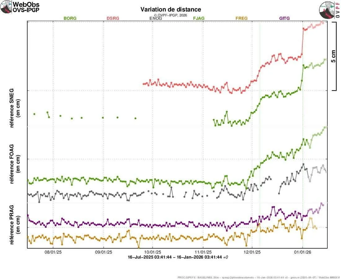 Les instruments de surveillance montrent également une poursuite de l’inflation de l’édifice volcanique. Après une phase de stabilité observée en décembre, le gonflement du volcan a repris fin décembre, peu avant l’intrusion magmatique du 1er janvier 2026, et se maintient depuis. Cette déformation indique que le système magmatique superficiel reste sous pression.