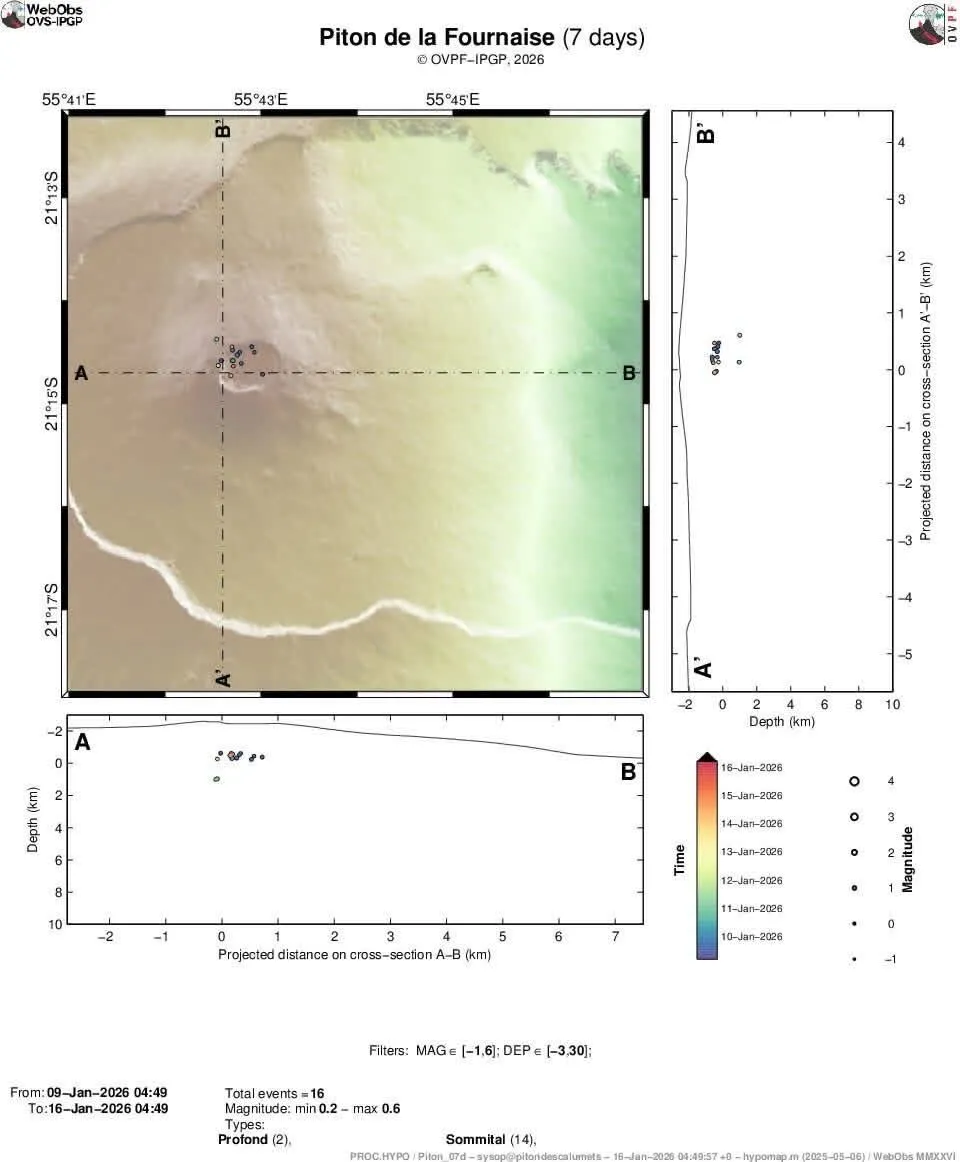 L’activité sismique se poursuit sous le Piton de la Fournaise, même si un net ralentissement est observé depuis le 10 janvier 2025. Selon les dernières données, le nombre de séismes volcano-tectoniques superficiels est passé d’une trentaine par jour à environ cinq. Ces secousses, de faible magnitude, restent principalement localisées sous les bordures nord et sud du cratère Dolomieu, à des profondeurs comprises entre 1,5 et 2,2 kilomètres.