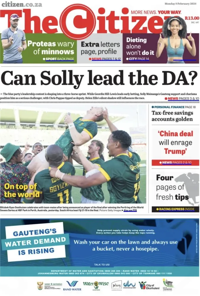 • Politique : « Can Solly lead the DA? » (course à la direction, en Une).