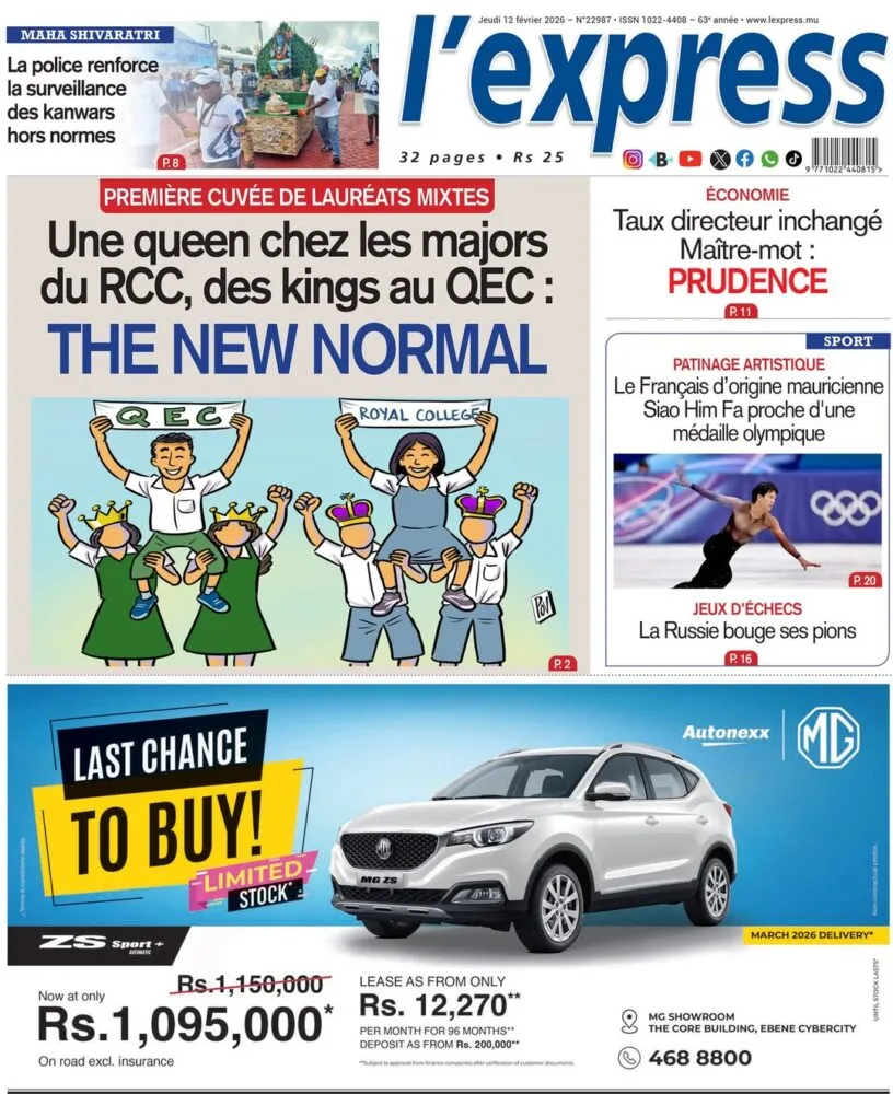 À Maurice, L’Express titre sur « THE NEW NORMAL ». Pour la première fois, une jeune fille intègre le Royal College Curepipe (RCC), établissement historiquement masculin, tandis que des garçons rejoignent le Queen Elizabeth College (QEC), jusqu’ici réservé aux filles.