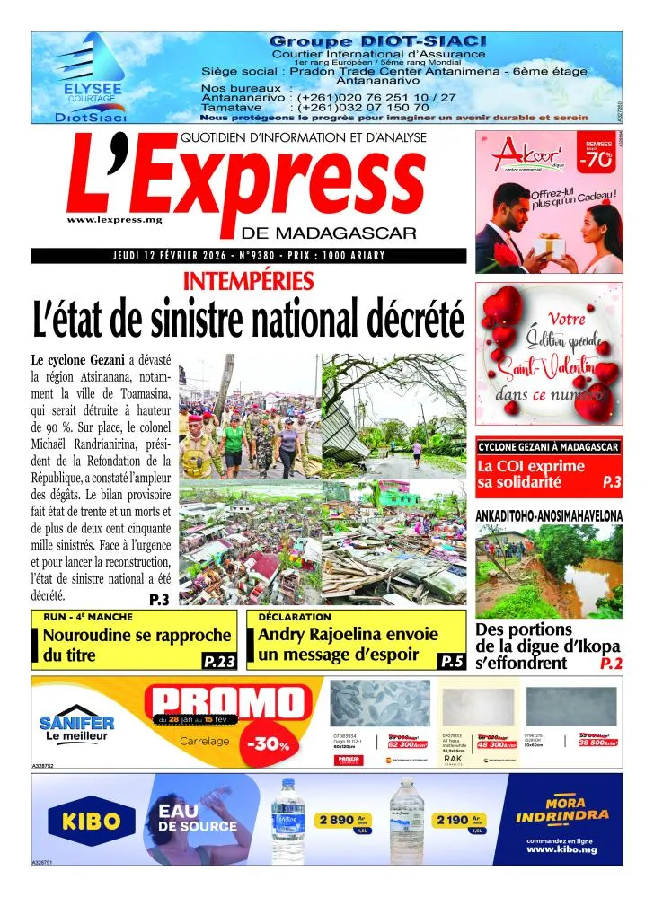 À Madagascar, L’Express de Madagascar annonce la proclamation de l’état de sinistre national après le passage du cyclone Gezani. Les dégâts sont importants dans plusieurs régions, notamment dans l’Est du pays.