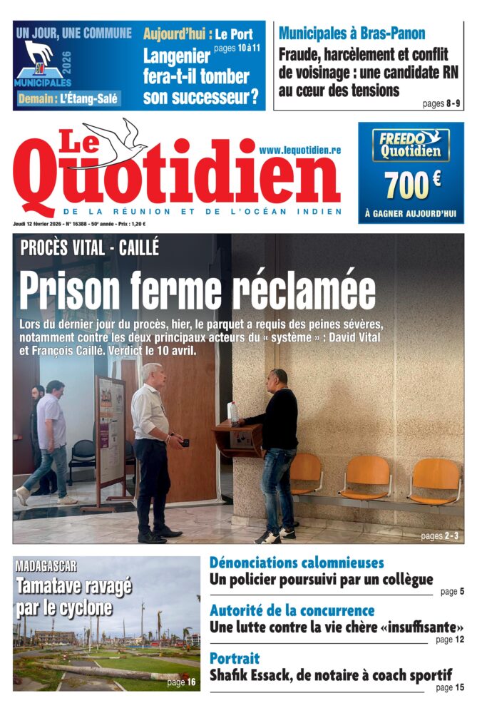 Le Quotidien consacre sa une au dernier jour du procès opposant David Vital et François Caillé. Le parquet a requis des peines sévères, dont de la prison ferme, contre les deux principaux acteurs de ce dossier qualifié de « système » structuré. Les réquisitions marquent un tournant dans cette affaire suivie depuis plusieurs mois. Le jugement a été mis en délibéré au 10 avril.