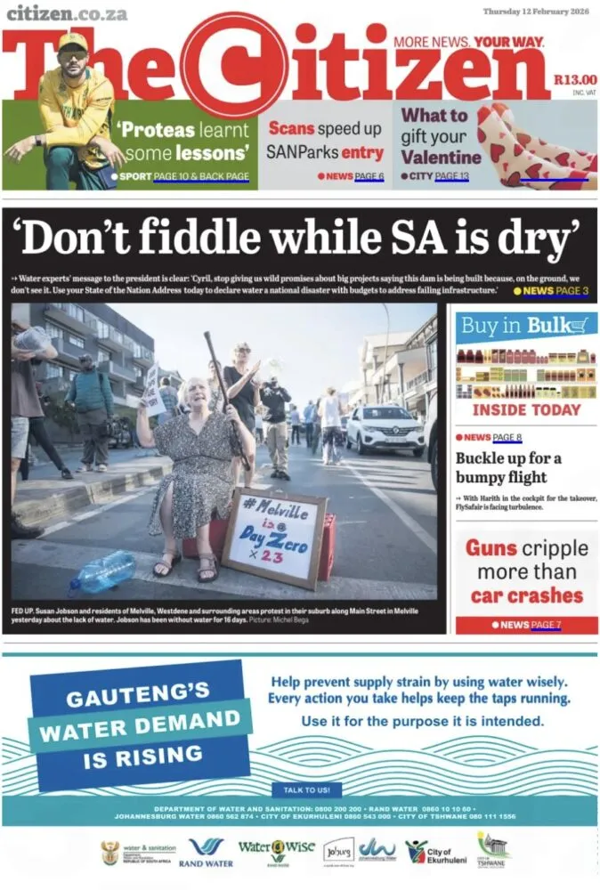 En Afrique du Sud, The Citizen titre sévèrement : « Don’t fiddle while SA is dry ». Le journal critique la gestion de la crise de l’eau par les autorités, estimant que les promesses politiques ne suffisent plus face à la sécheresse persistante.
