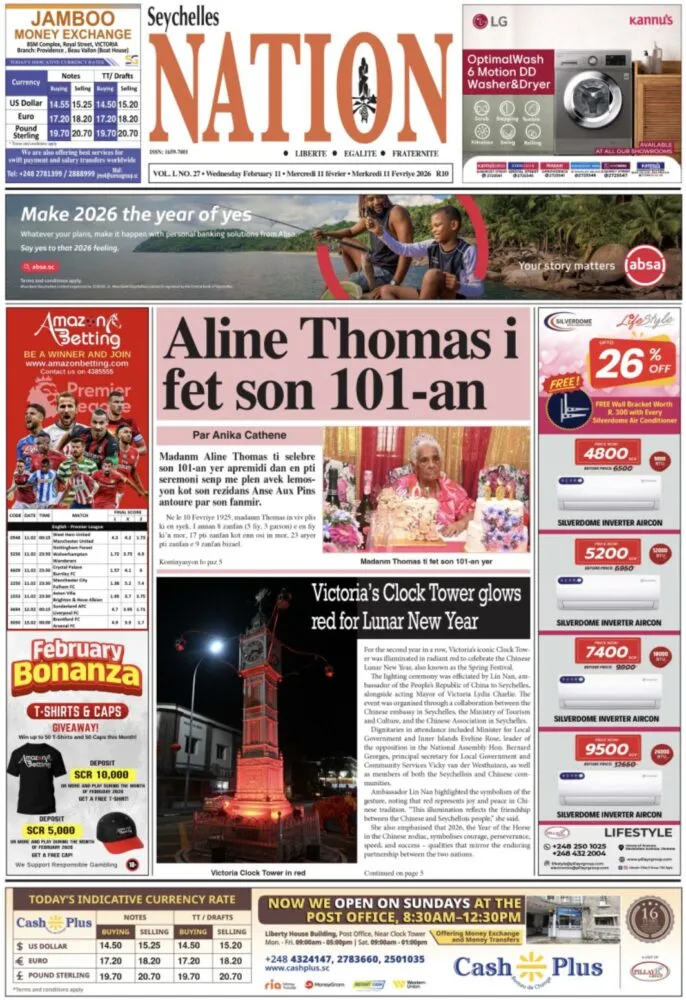 Aux Seychelles, Seychelles Nation consacre sa une à l’anniversaire d’Aline Thomas, qui célèbre ses 101 ans. Un événement symbolique qui met en lumière la longévité et les traditions familiales.