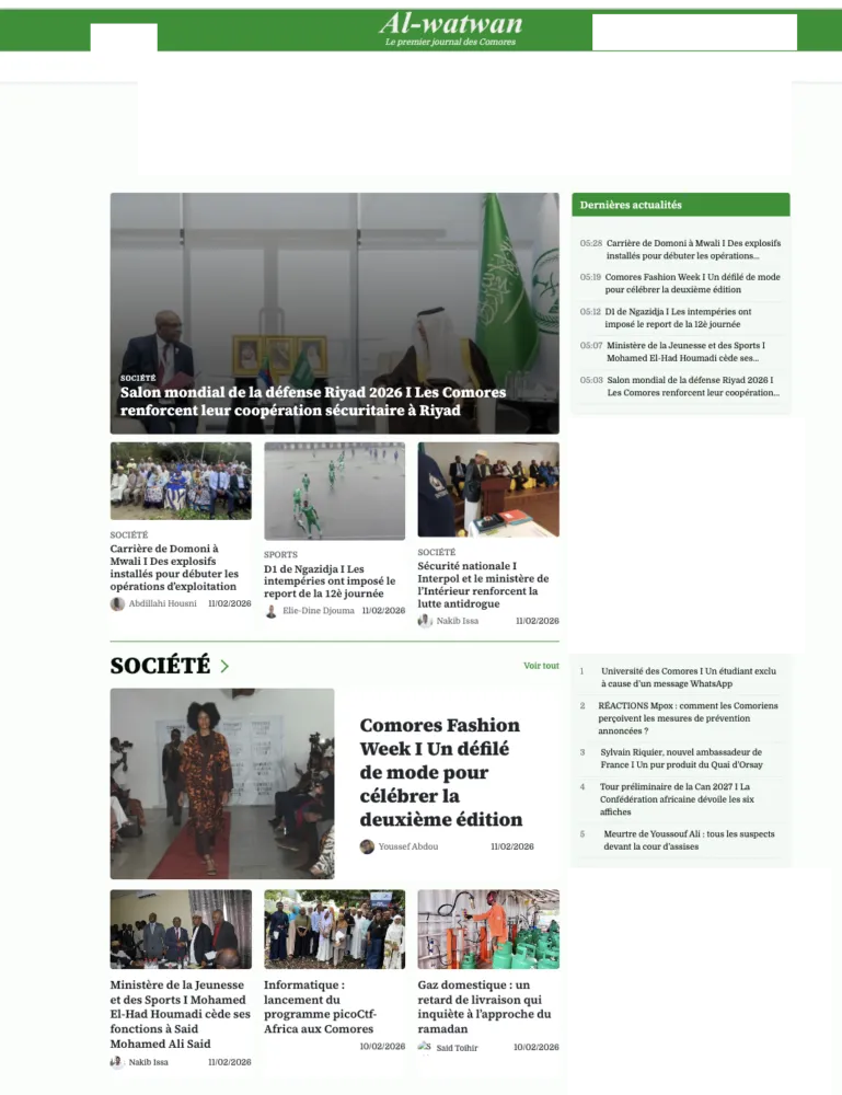 Al-Watwan met en avant la participation des Comores au Salon mondial de la défense à Riyad. Les autorités comoriennes affichent leur volonté de renforcer la coopération sécuritaire avec leurs partenaires internationaux.