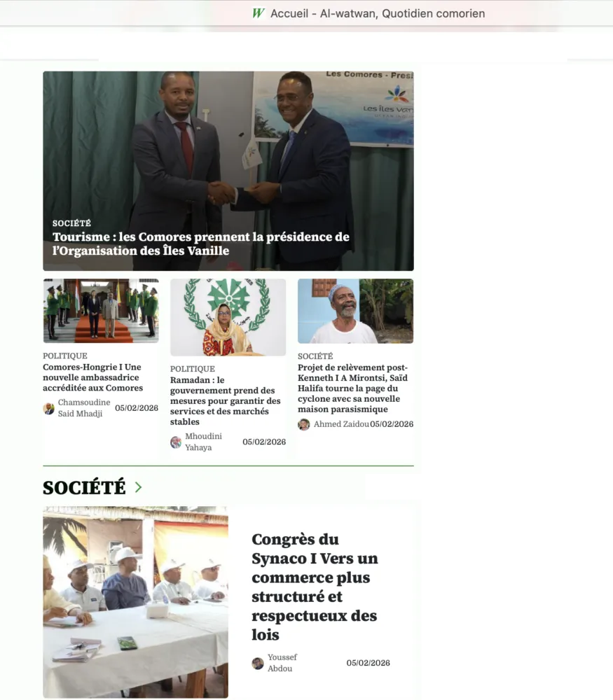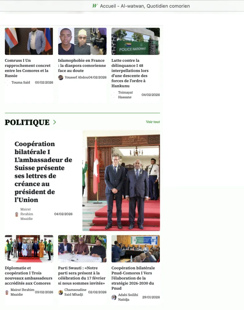 Aux Comores, Al-watwan met en avant la coopération régionale, avec la présidence comorienne de l’Organisation des îles Vanille. Les questions de gouvernance, de sécurité et de développement communautaire occupent une place centrale, tout comme les projets en faveur de la jeunesse et des femmes.