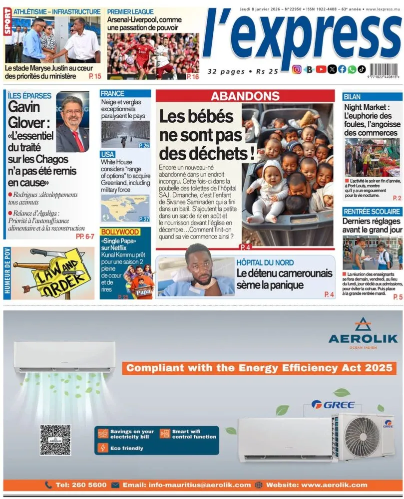 Le journal traite également de faits divers graves, dont l’abandon d’un nouveau-né dans des toilettes d’hôpital, et revient sur les secousses touchant le centre financier mauricien dans un contexte international sensible.