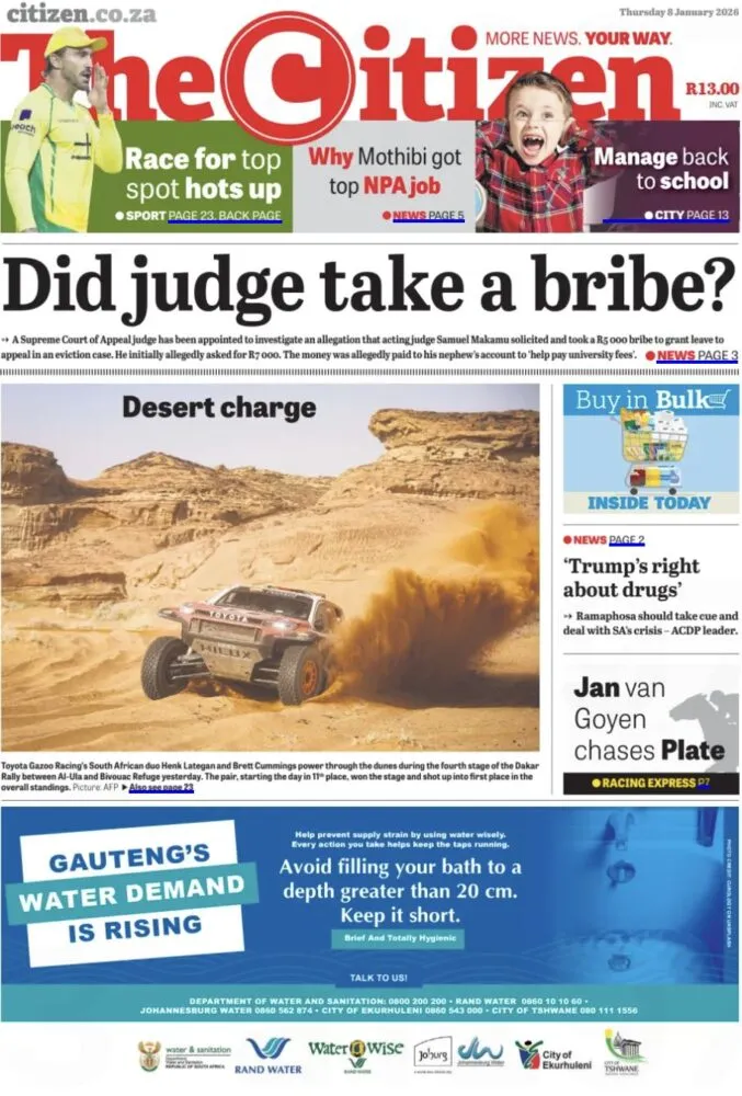 The Citizen ouvre sur une affaire judiciaire sensible, avec une enquête visant un juge soupçonné d’avoir accepté un pot-de-vin. L’affaire suscite un vif débat sur l’intégrité du système judiciaire sud-africain.