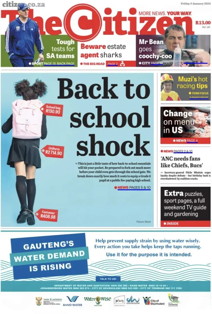 The Citizen consacre sa Une au coût élevé de la rentrée scolaire en Afrique du Sud. Uniformes, sacs et fournitures pèsent lourdement sur le budget des familles, ravivant le débat sur les inégalités sociales et l’accès à l’éducation.