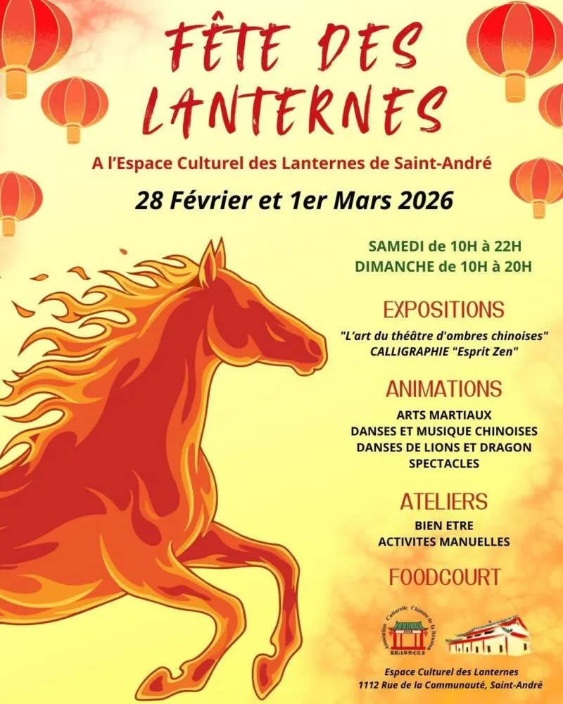 Les samedi 28 février et dimanche 1er mars 2026, l’Espace Culturel des Lanternes à Saint-André vibrera au rythme de la Fête des Lanternes, placée cette année sous le signe du Cheval de Feu. Un rendez-vous festif et culturel qui promet une immersion totale dans les traditions chinoises, entre spectacles, expositions et gourmandises.